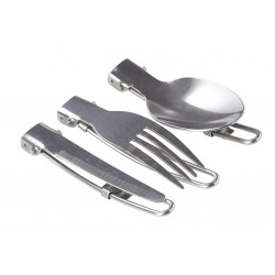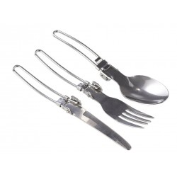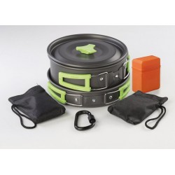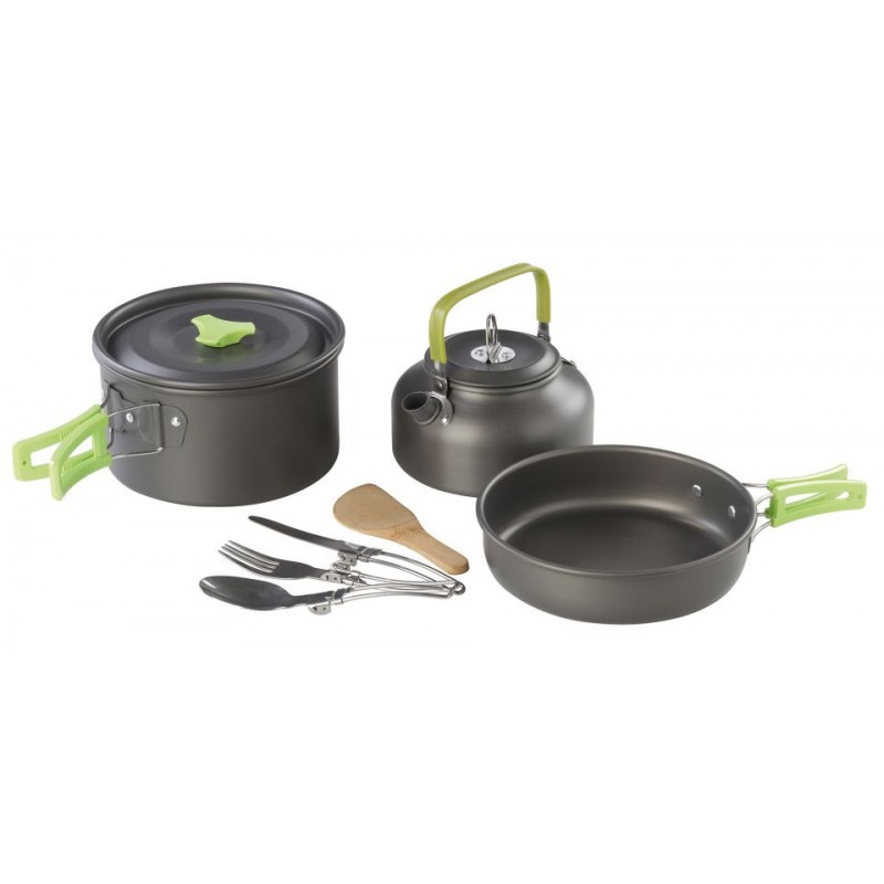 3 dielny set riadu s elexovanou povrchovou úpravou, 2 skladacie nerezové príbory a drevená vareška. Všetko zabalené v textilnom púzdre. Set sa skladá z hrnca s objemom 1,2l, kanvičky s objemom 0,7l a panvičky.